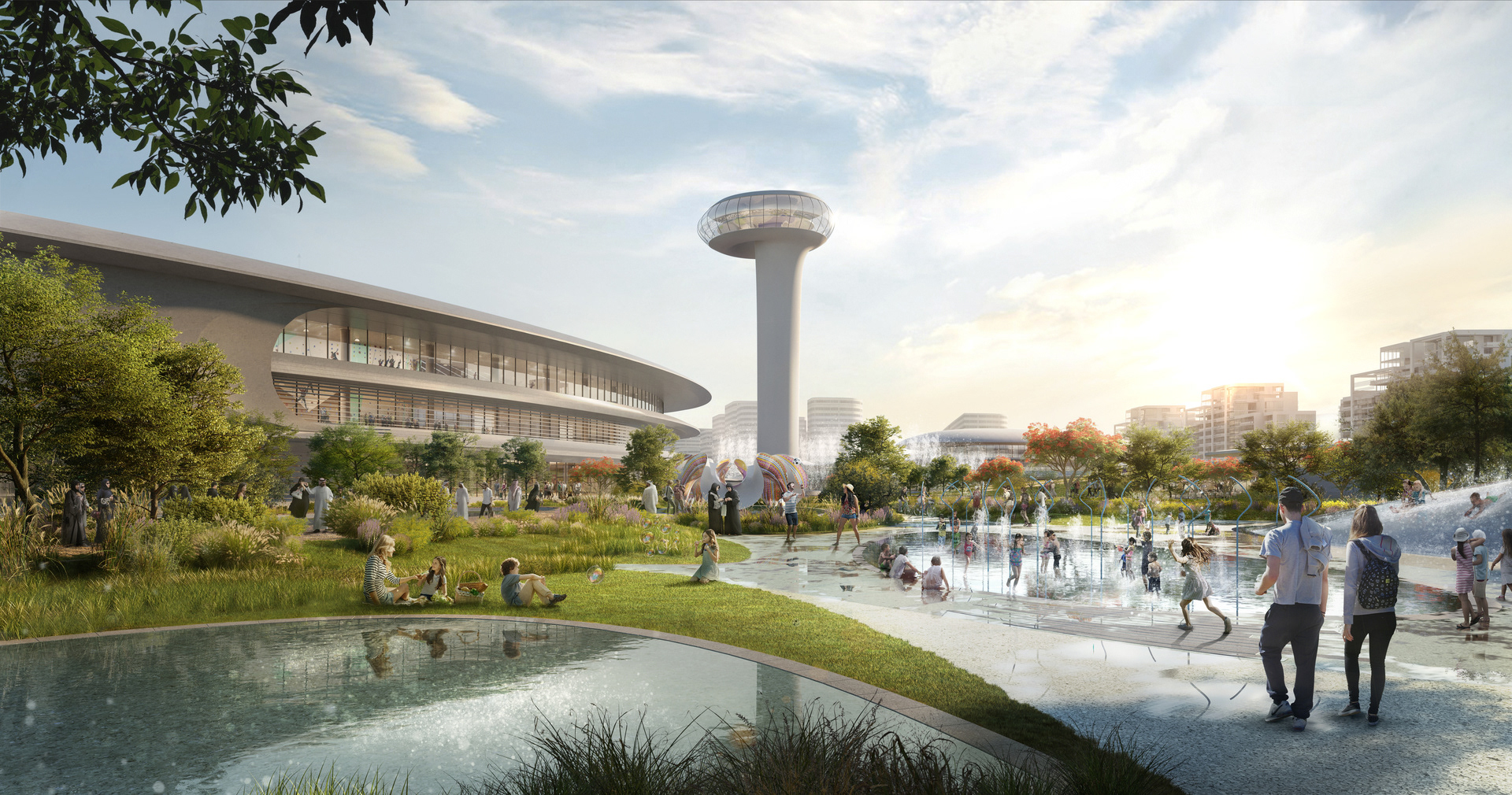 the first moment a water droplet strikes the earth’s surface, captured in an array of elliptical buildings that are designed to channel prevailing winds into public spaces and courtyards to aid natural cooling. Arada’s commitment to sustainability and smart technologies is integrated within