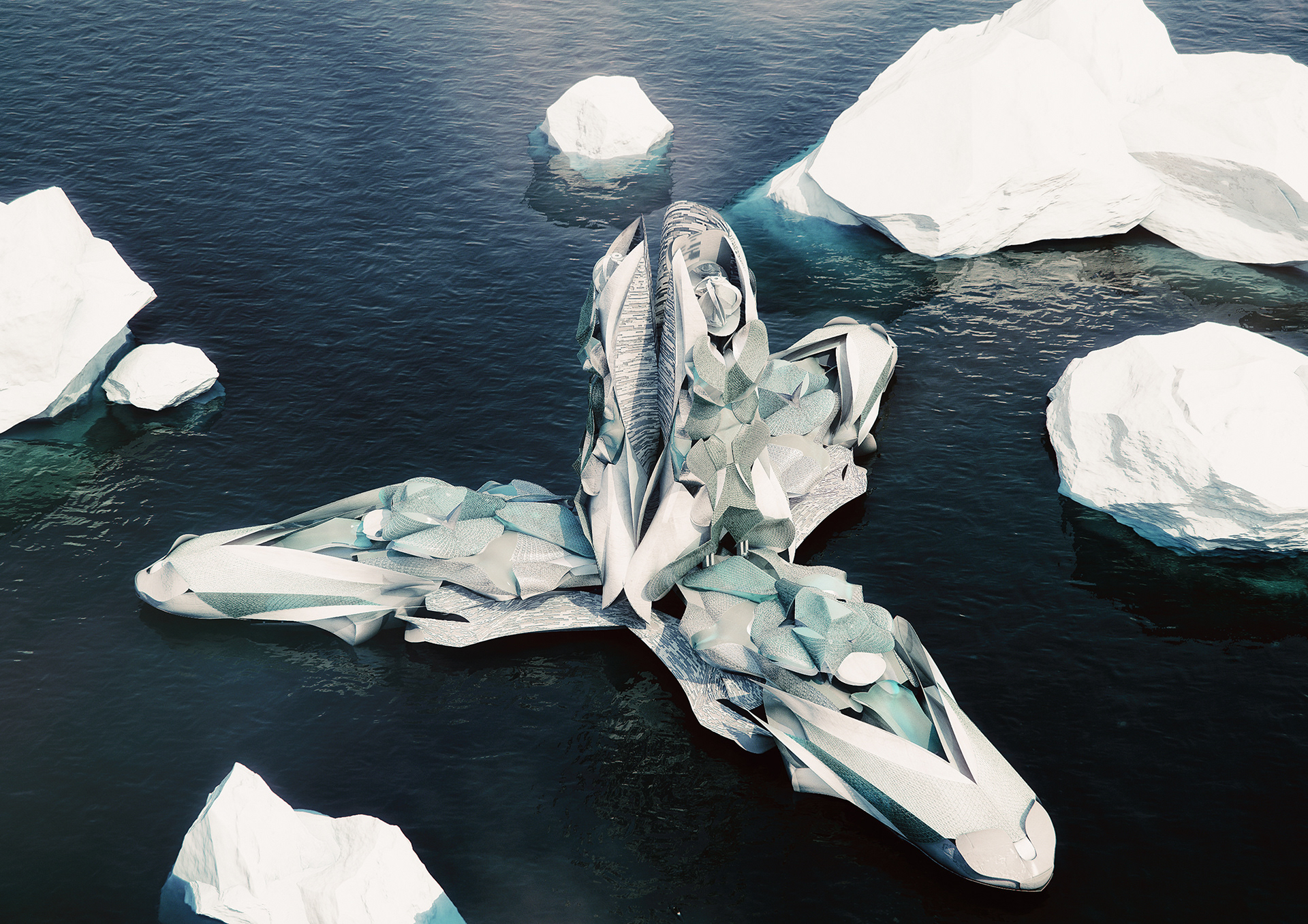 The ARKantica is changing its appearance over the year to effectively work with the climate. Over the summer the stations are floating around the continent, carrying drones on board those fly to the distant location on the land gathering material for future research.