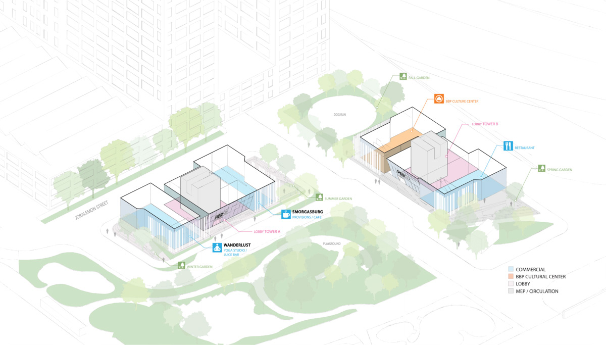 At street level, the approach shifts towards continuity with landscape and public life. The base of the buildings is integrated into the park terrain to form new seasonally responsive public spaces, directly connected to a suite of public services and amenities. Decorative screening, drawing inspiration from the elegant yet powerful sculptural language of Harry Bertoia, operates as both a device of scale modulation and a permeable filter, mediating between built form, planting, and the wider landscape of Brooklyn Bridge Park.